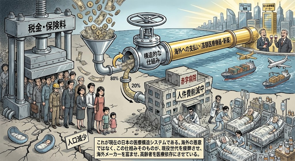 私たちが納めた税金や保険料で、その多くが、海外からの高額な医療機器や薬品への支払いとして、国内から流出しています。