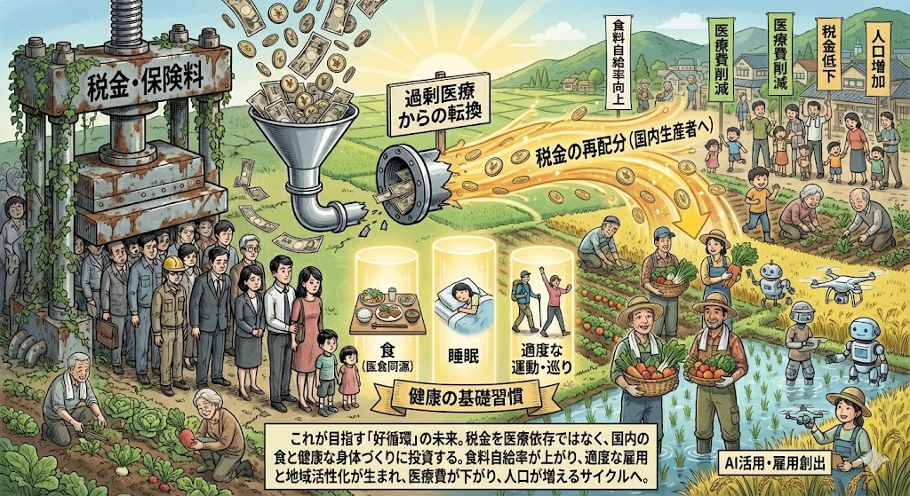 この問題の根底を変えるのは、最も難しいことの一つではあるとは思うのですが、主要な一部を単純化した話をすると税金が上がるのは医療費の為だというリアルがあり、日本国民が食を削って医療に金を割いていると詰むのです。